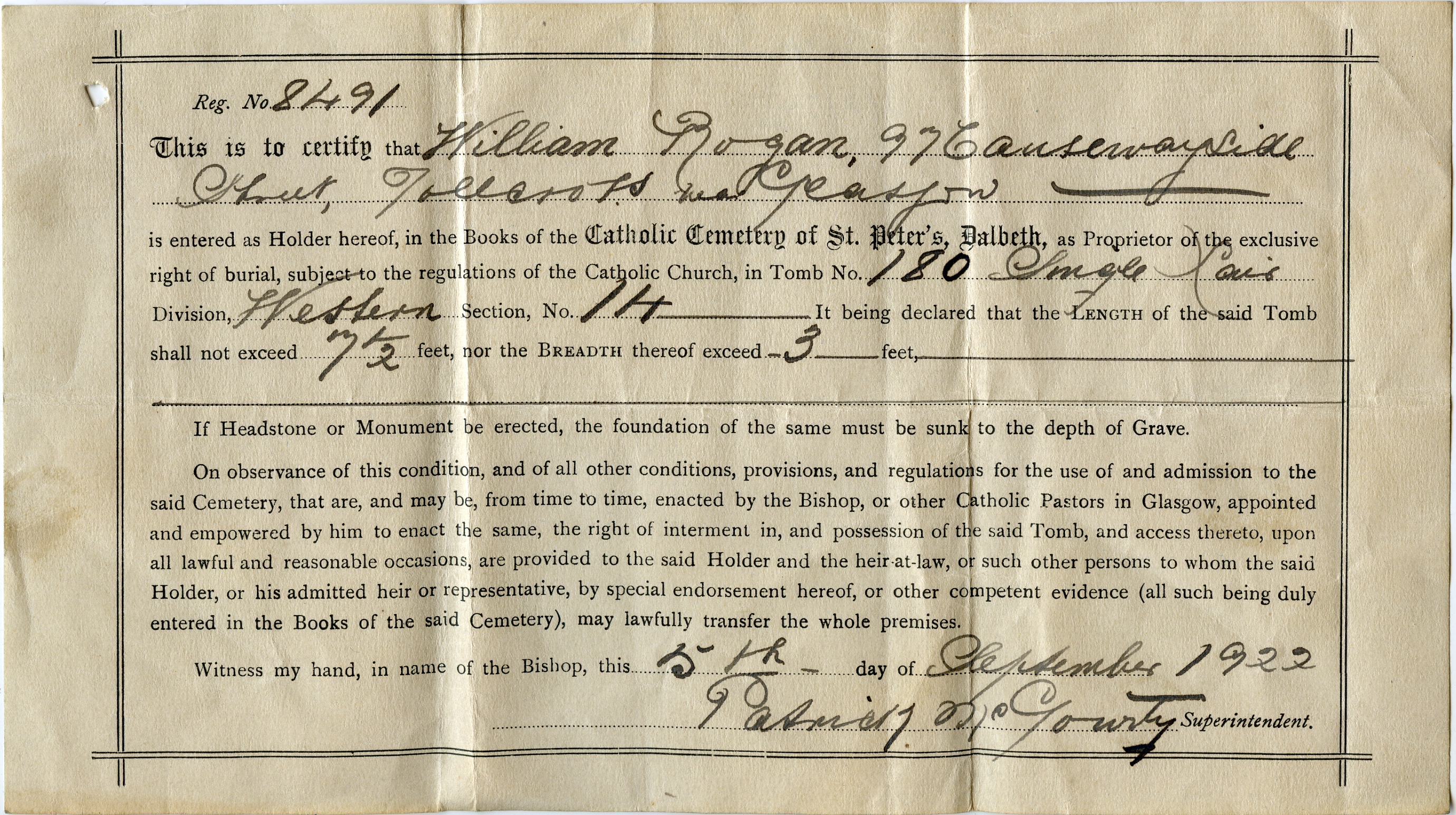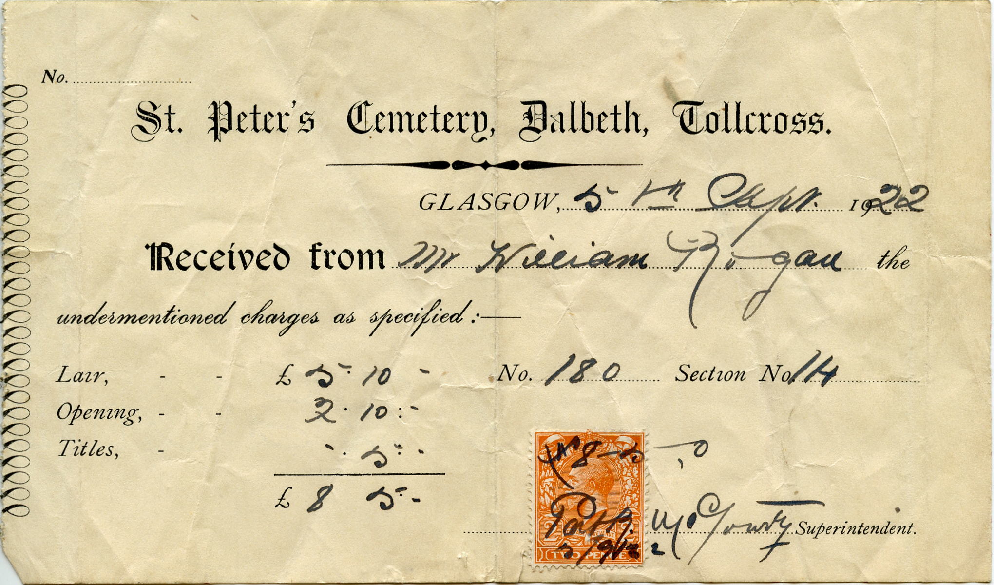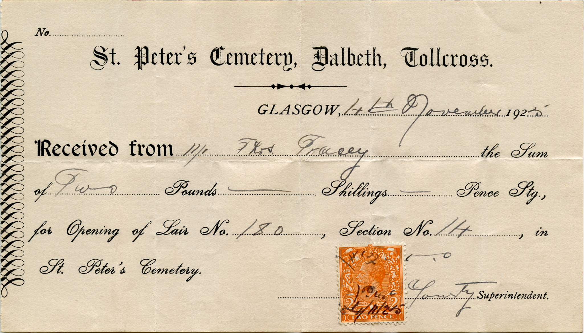 | Receipt for buying and opening up the lair | Deed for the lair | The receipt for the burial, but no name mentioned. |