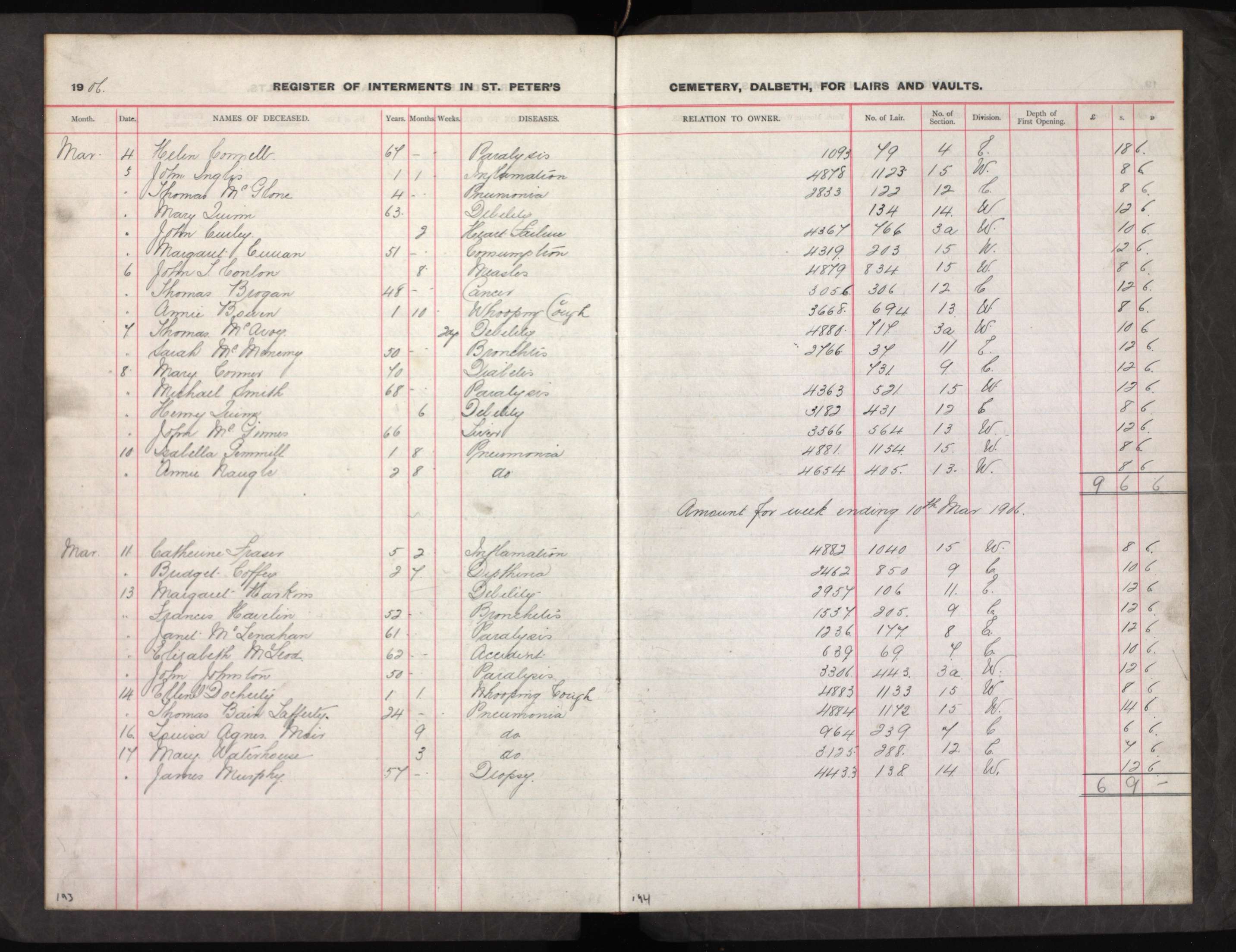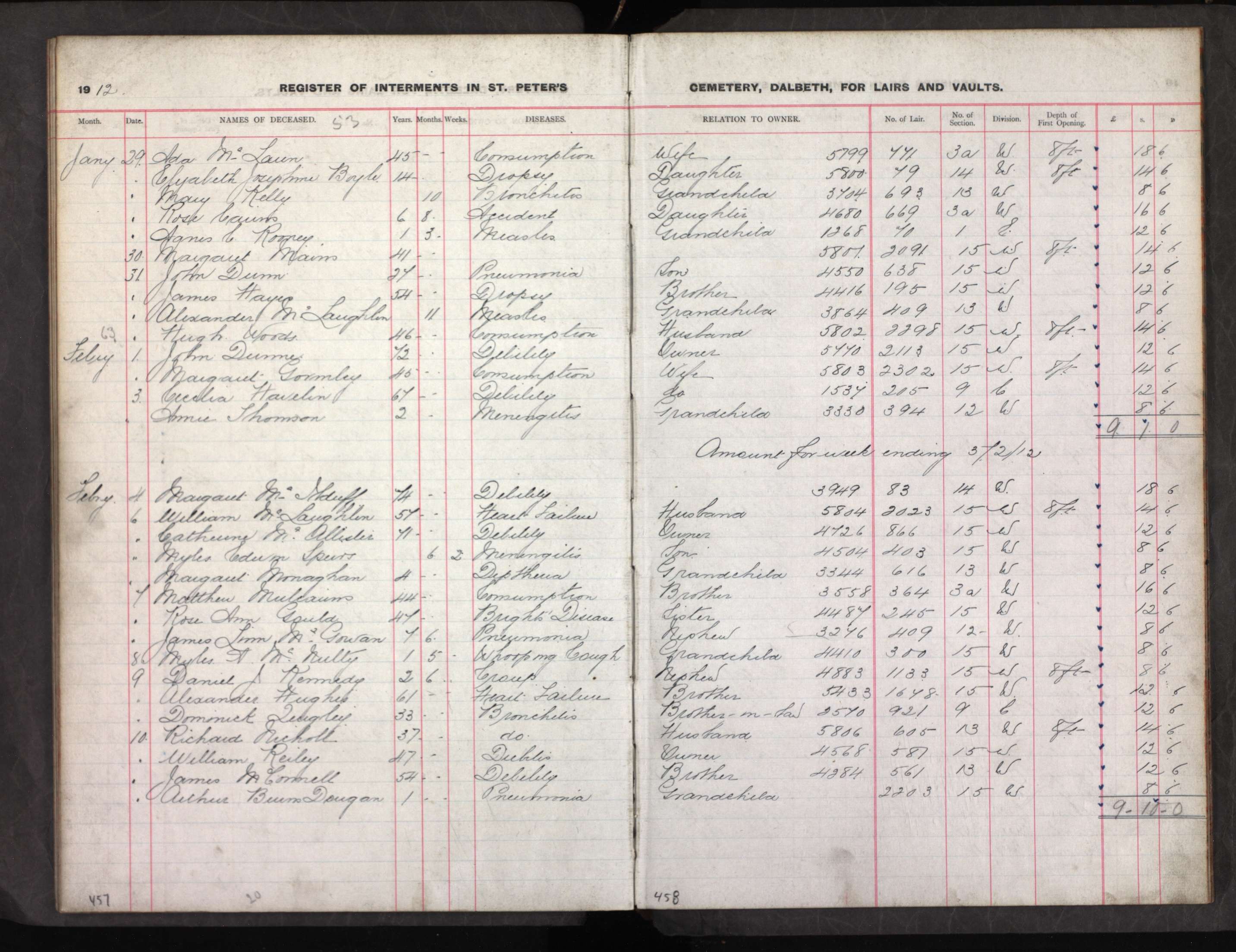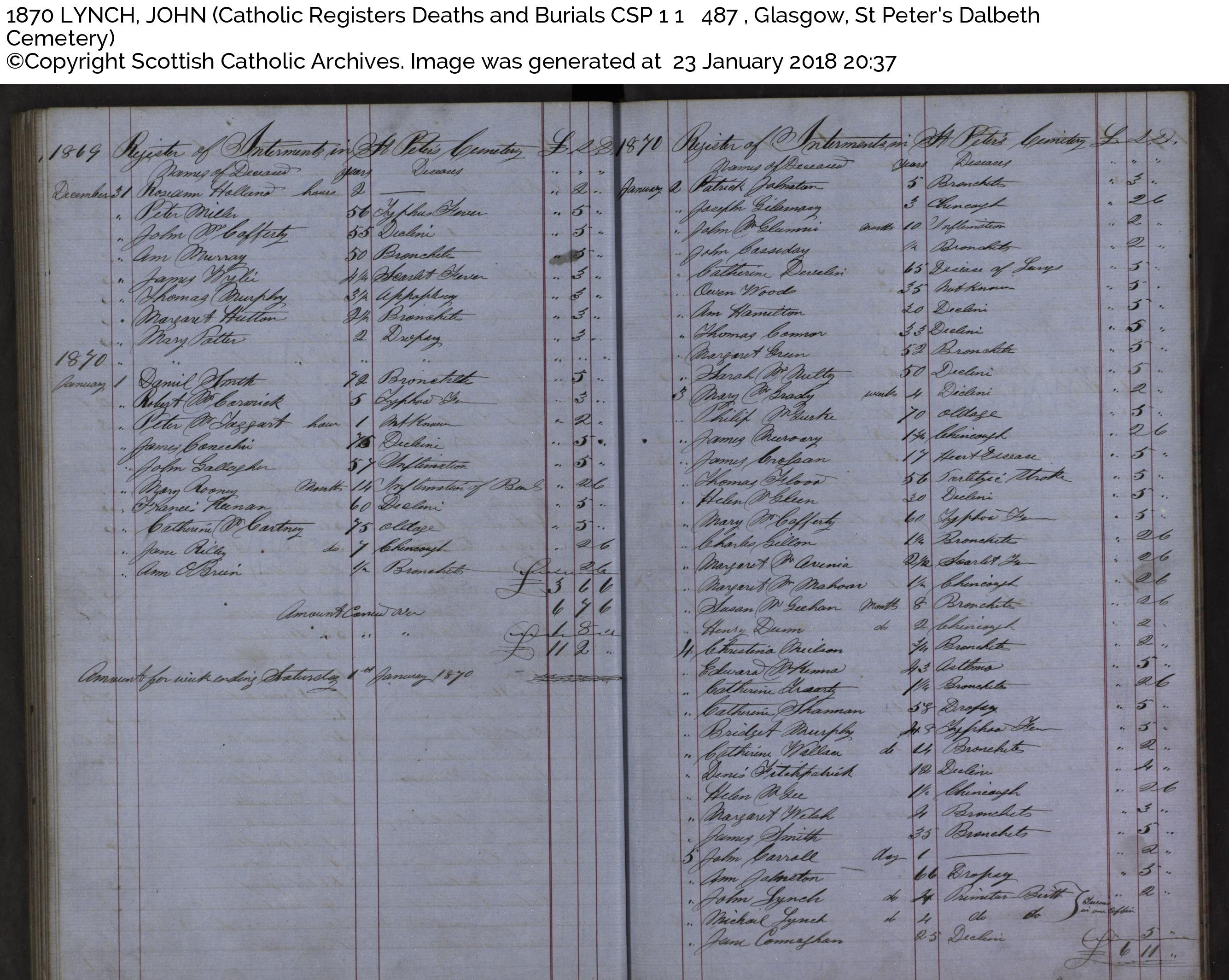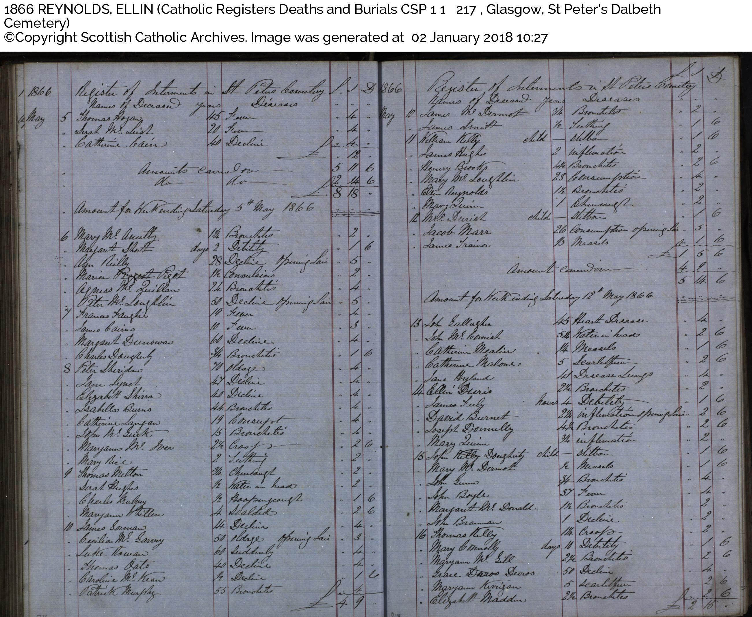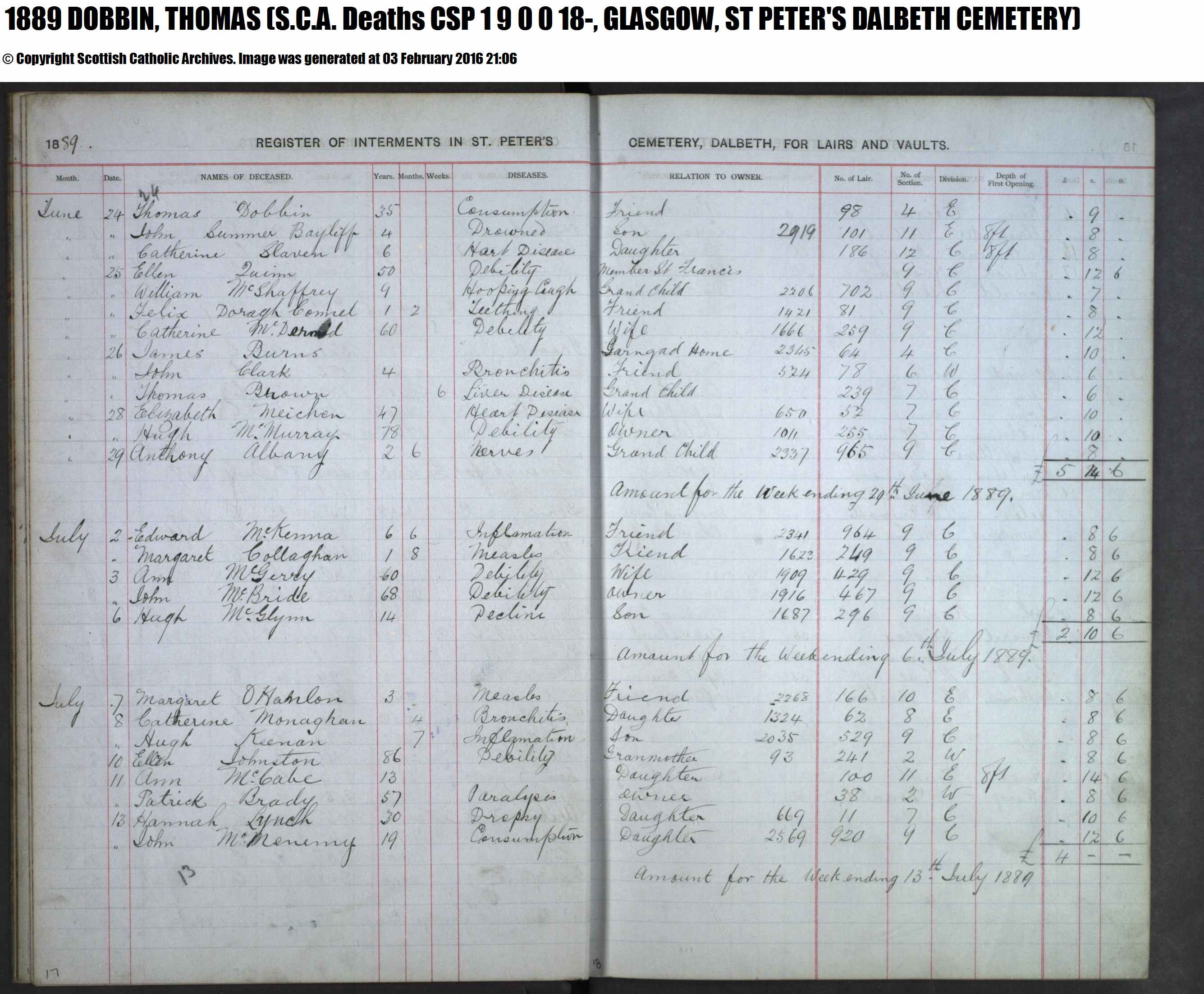 A list with details of burials at Dalbeth.