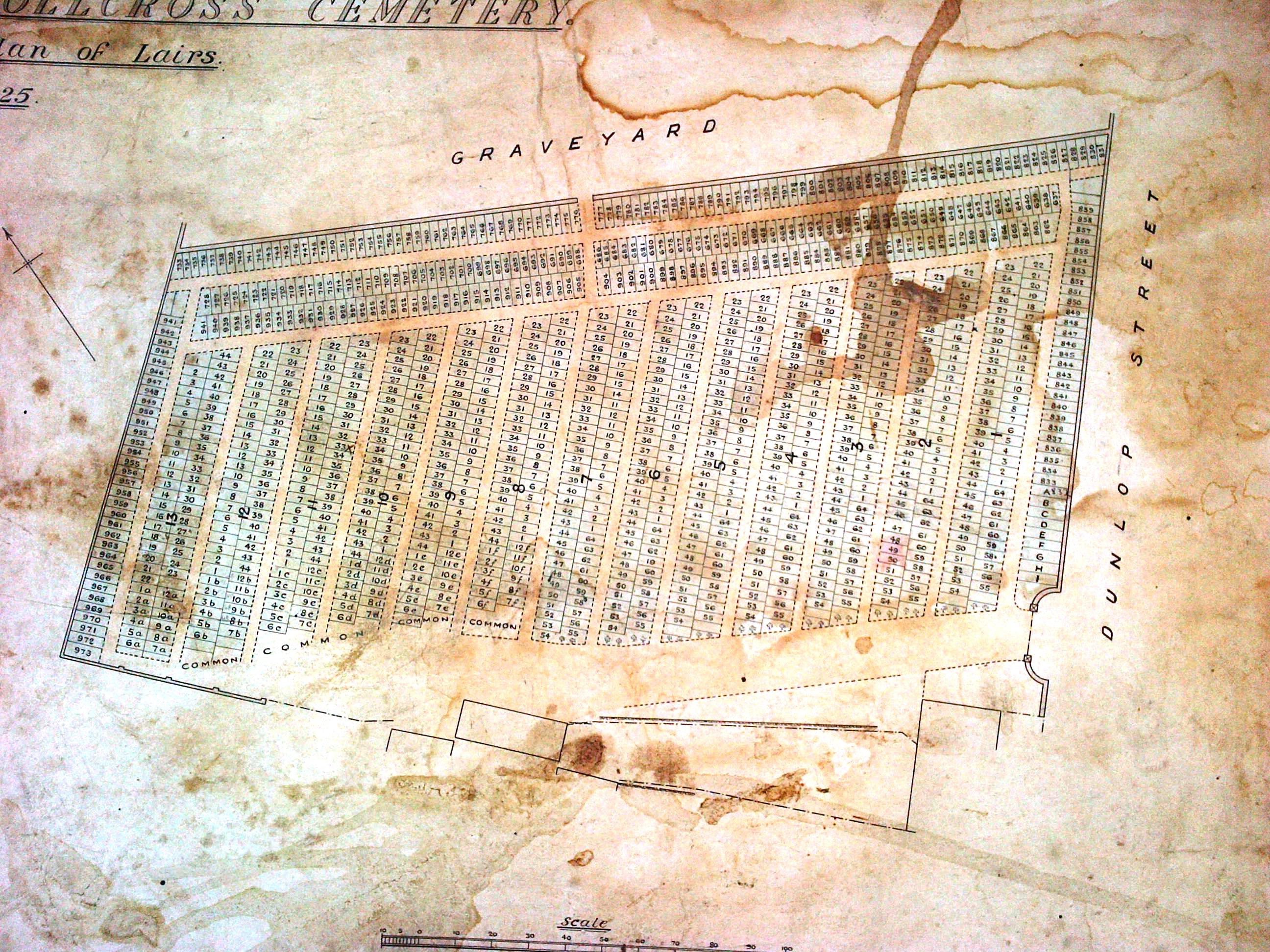 A 3 page spreadsheet with details of burial lairs at Dalbeth, with cross-references to the Family Details sections of the main Geneology Database.
