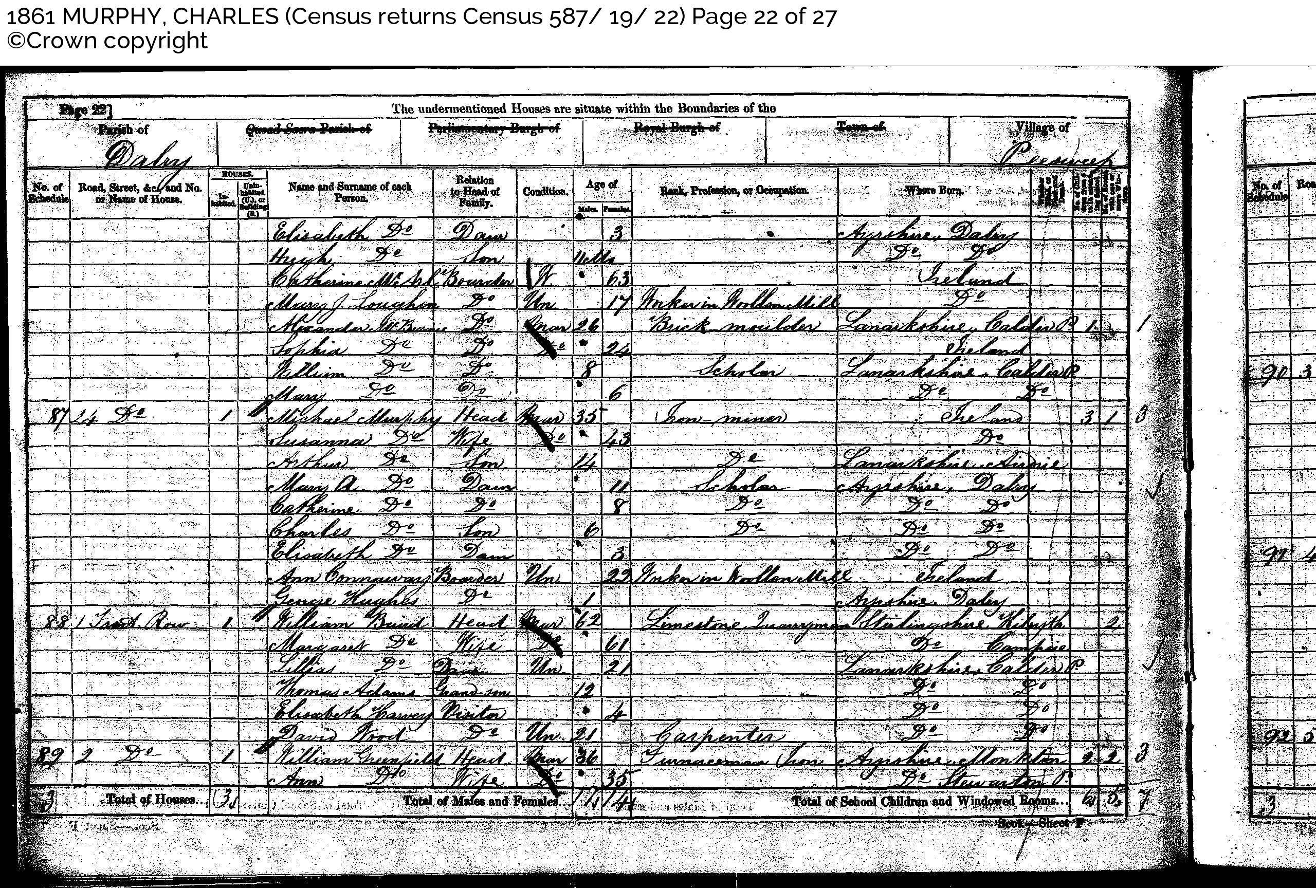 Rel. Mar. Age Occupation Birthplace Daniel McVay Head Mar 33 Ironstone Miner Ireland 1 Sarah do. Wife Mar 32 do. Mary Ann do. Daur 3 Lanarkshire, Shotts Bridget do. Daur 1 Ayrshire, Sorn Patrick do. Brother Unm 24 Ironstone Miner Ireland