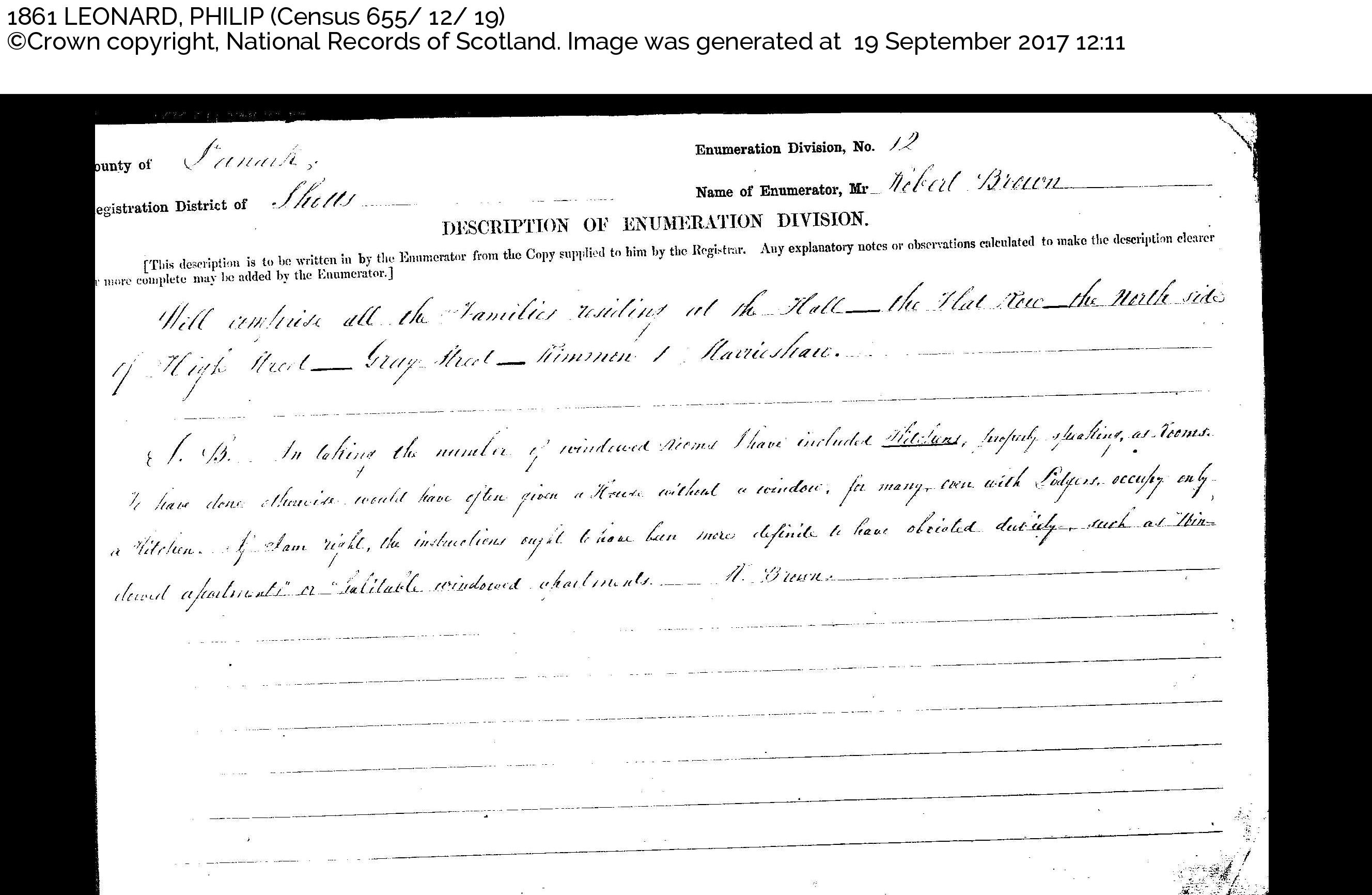 NB. In noting the number of windowed rooms I have included kitchens, properly speaking, as rooms. To have done otherwise would have often given a House without a window, for many, even with Lodgers, occupy only a kitchen. If I am right, the instructions ought to have been more definite to have obviated dubiety, such as "Windowed apartments" or "Habitable windowed apartments". H. Brown.