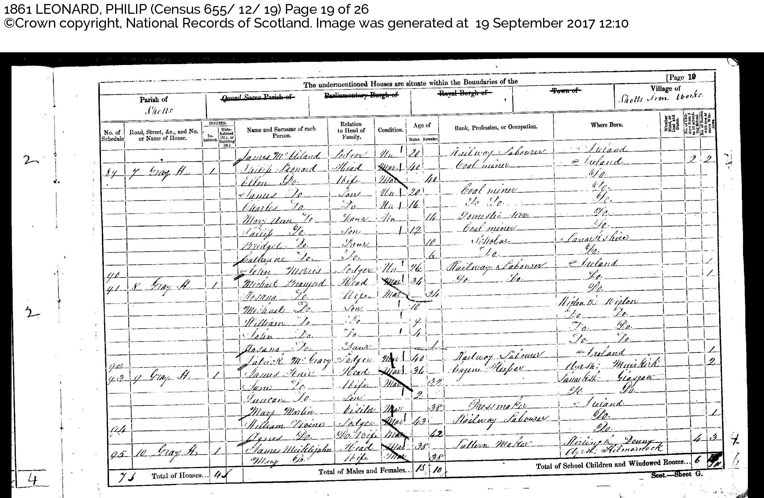 Rel. Mar. Age Occupation Birthplace Con Houston Head Mar 45 Coal Miner Ireland 0 | 1 Mary do. Wife Mar 38 do. Thomas do. Son Un 17 do., do Ayrshire, Kilbirnie Patrick do. Son do. 15 do., do do., do John do. Son do. 13 do., do do., do Con do. Son do. 8 Scholar do., do 1 | - Elizabeth do. Daur do. 6 do. Lanarkshire, Glasgow 1 | - Manan do. Son do. 4 do., do