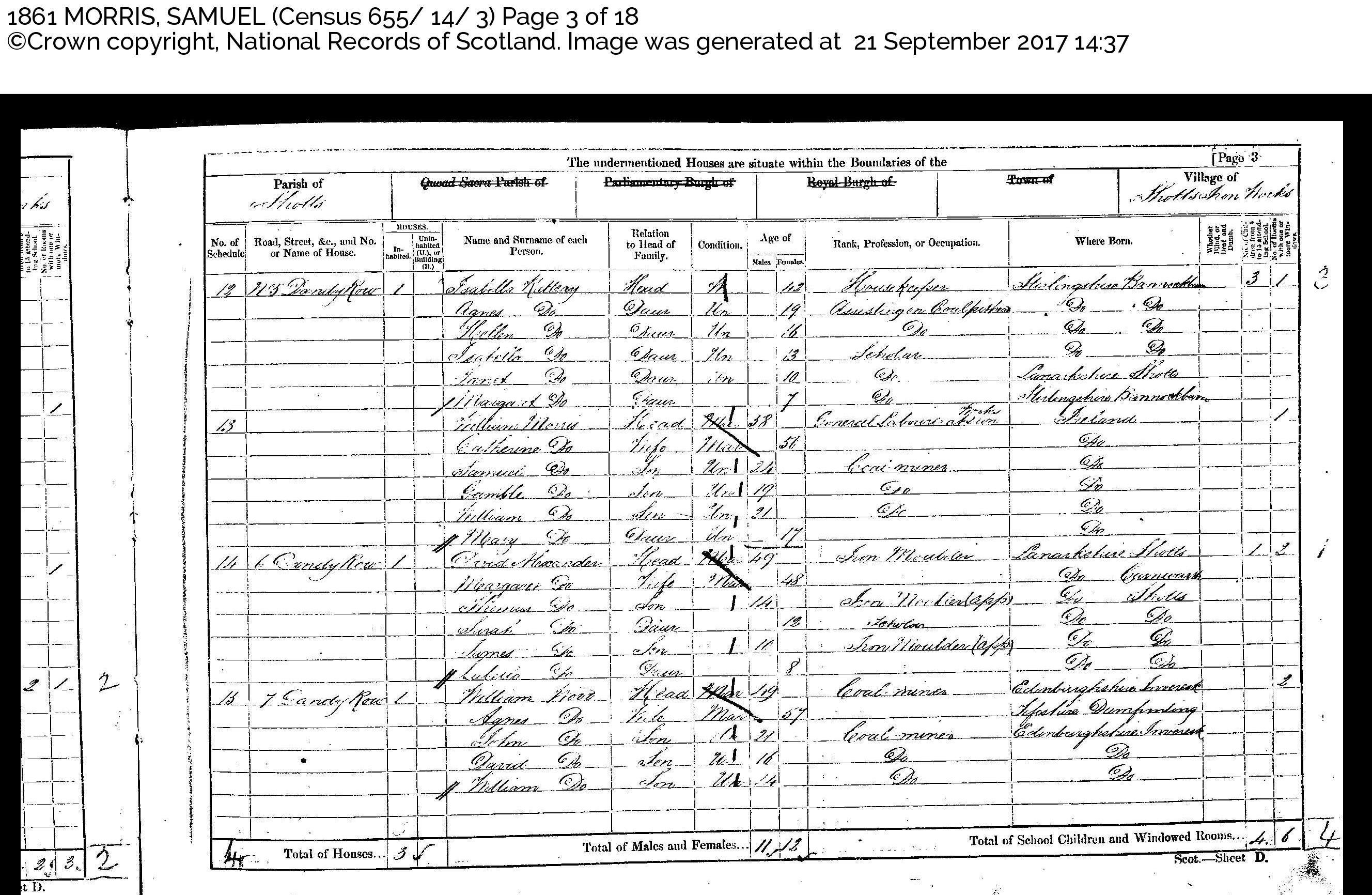 at Iron WorksIreland 1 Catherine do. Wife Mar 56 do. Samuel do. Son Un 24 Coalminer do. Garrible do. Son Un 19 do. do. William do. Son Un 21 do. do. Mary do. Daur Un 17 do. Page 3 Schedule No.14 - No.6 Dandy Row — Alexander, David 49, Margaret 48, etc.