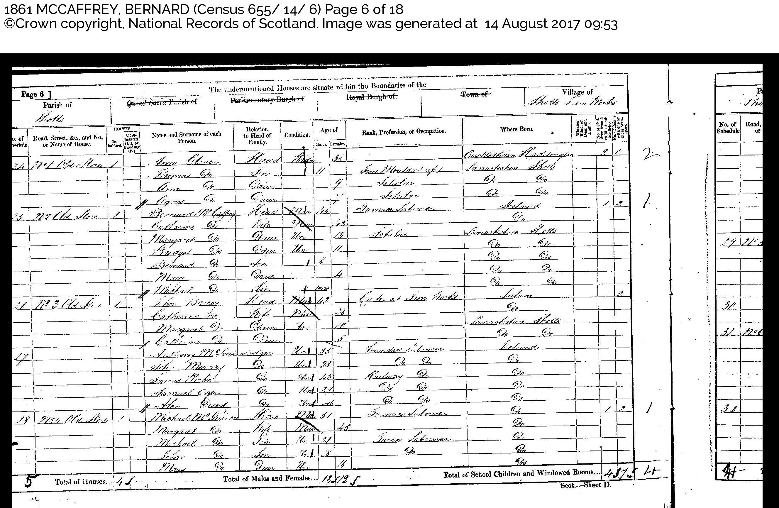 Rel. Mar. Age Occupation Birthplace Bernard McCaffrey Head Mar 44 Furnace Labourer Ireland 1 | 2 Catherine [Gunn] Wife Mar 42 do. Margaret do. Daur Un 13 Scholar Lanarkshire, Shotts Bridget do. Daur Un 11 do., do. Bernard do. Son 8 do., do. Mary do. Daur 4 do., do. Michael do. Son 1 mo do., do. Page 6 Schedule No.26 - No.3 Old Store — Barrey, John 42, Catherine 28, Margaret 10, Catherine 5