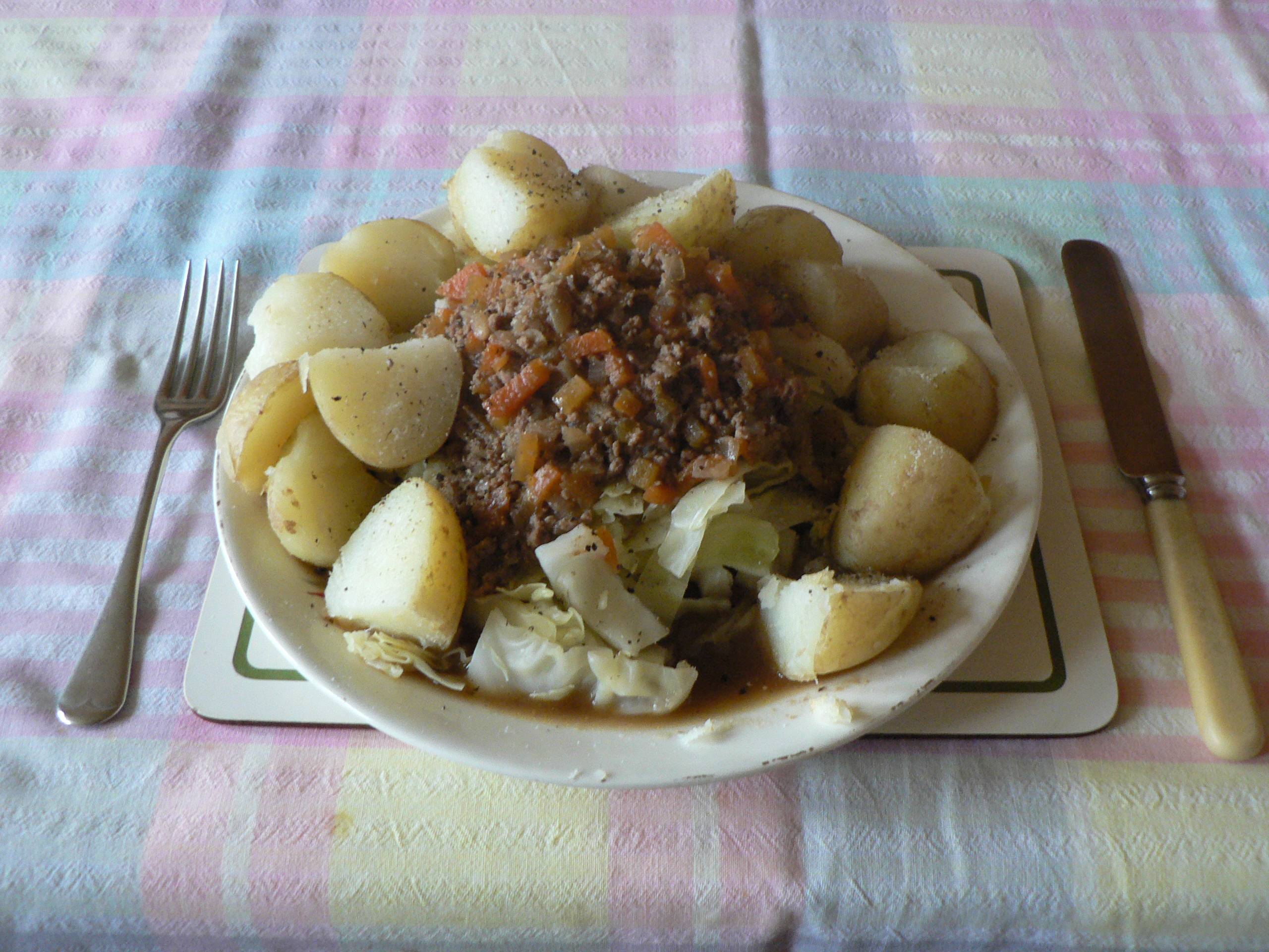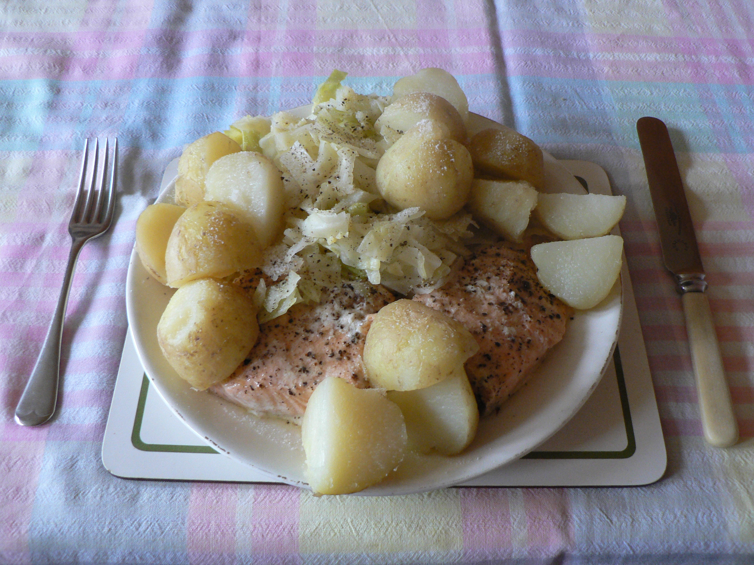 | Karen was talking about photographing meals for a blog. Here's mine, with potatoes & cabbage. | ||