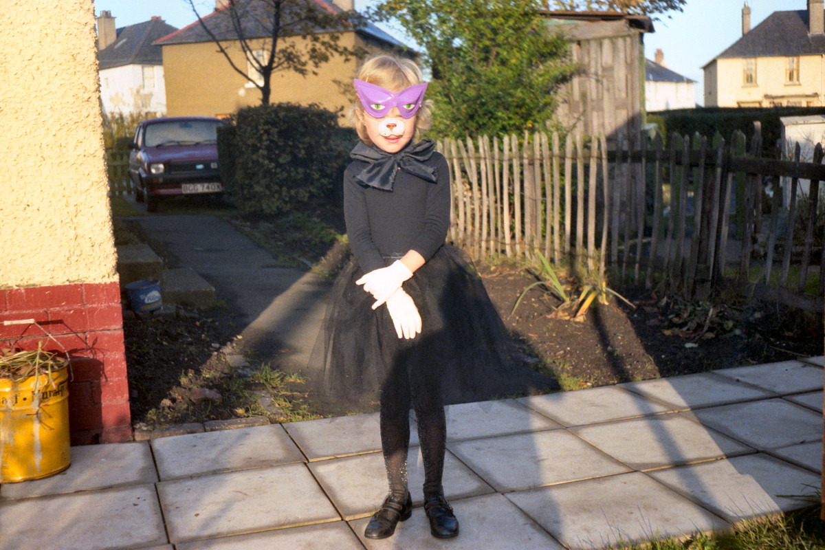 Fiona dressed as a cat for Halloween.