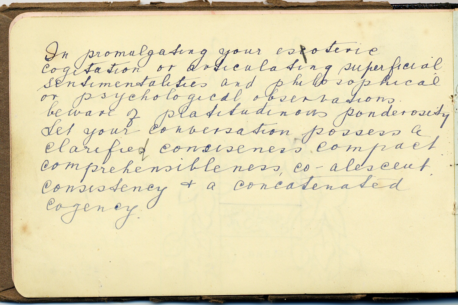 "In promulgating your esoteric cogitation or articulating superficial sentimentalities and philosophical or psychological observations beware of platitudinous ponderosity. Let your conversation possess a clarified conciseness, compact comprehensibleness, co-alescent consistency & a concatenated cogency." |