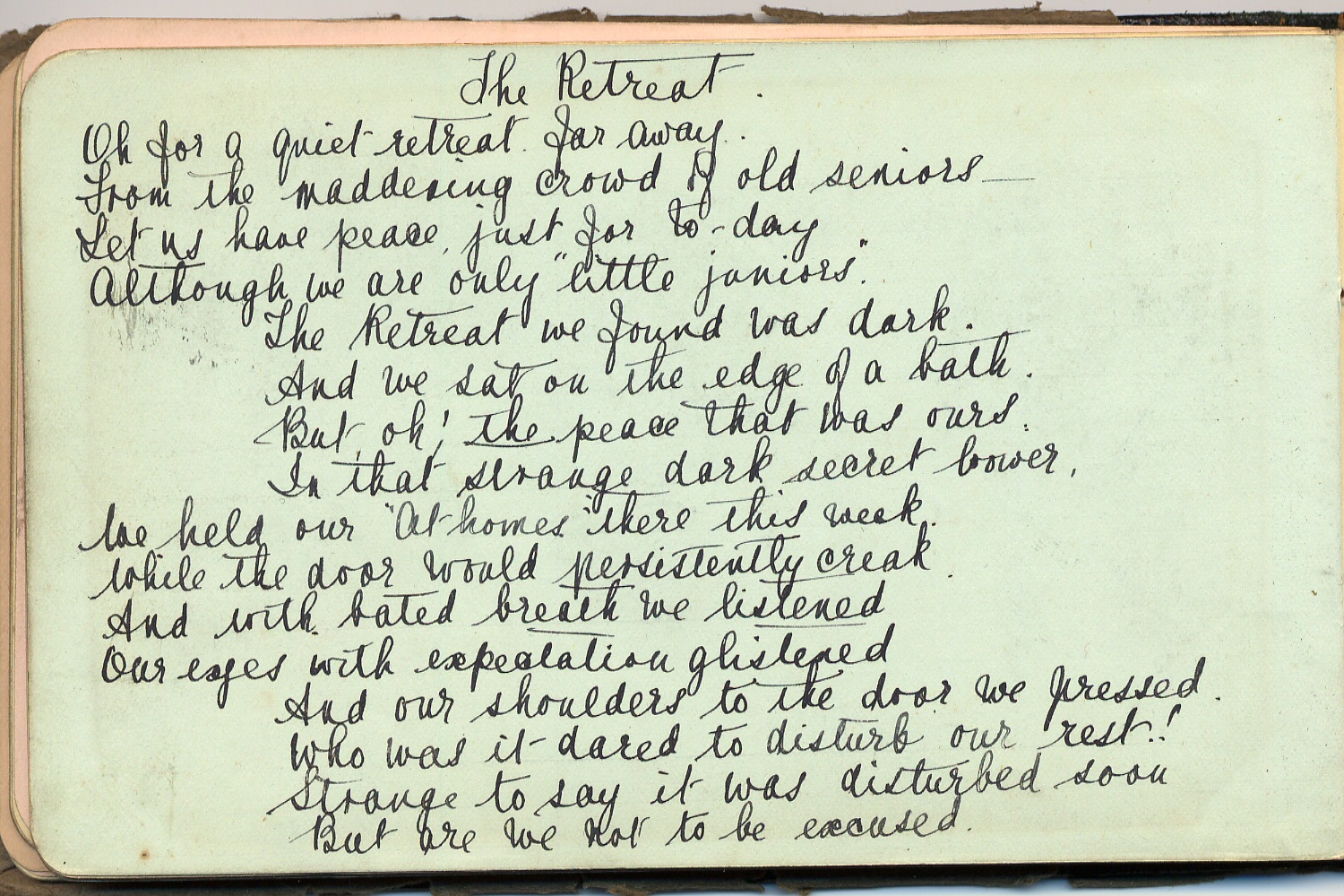 | The Retreat Oh for a quiet retreat far away The Retreat we found was dark We held our "At homes" there this week And out shoulders to the door we pressed |