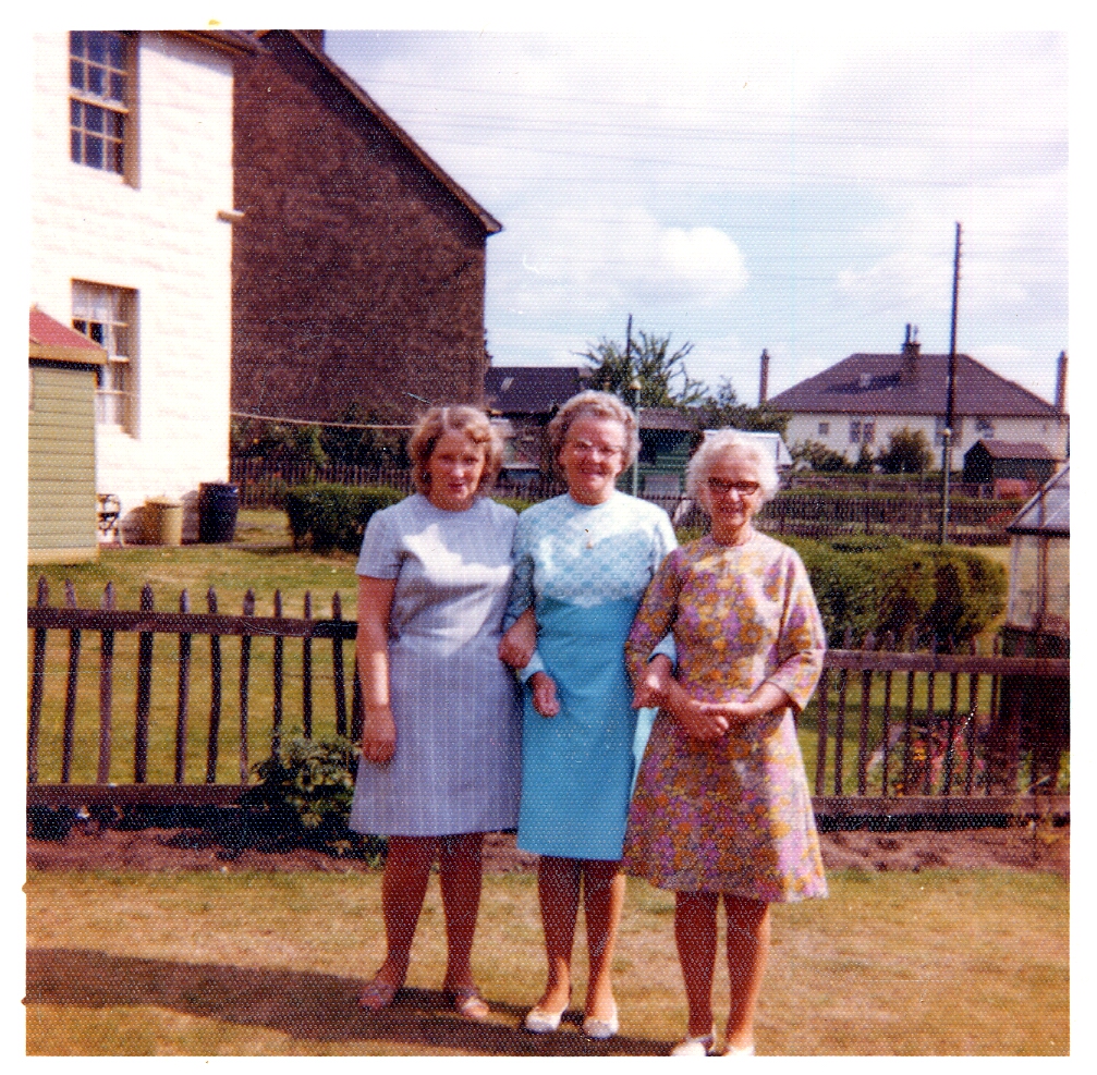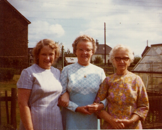"Sandyhills July 74 They grew in beauty side by side" Rosa, Margaret, Hilda at Amulree Street, Glasgow |