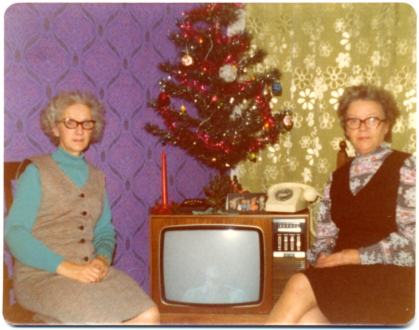 | "Taken earlier - Christmas 1974 Pauline Kath Hilda George & Suzanne" |