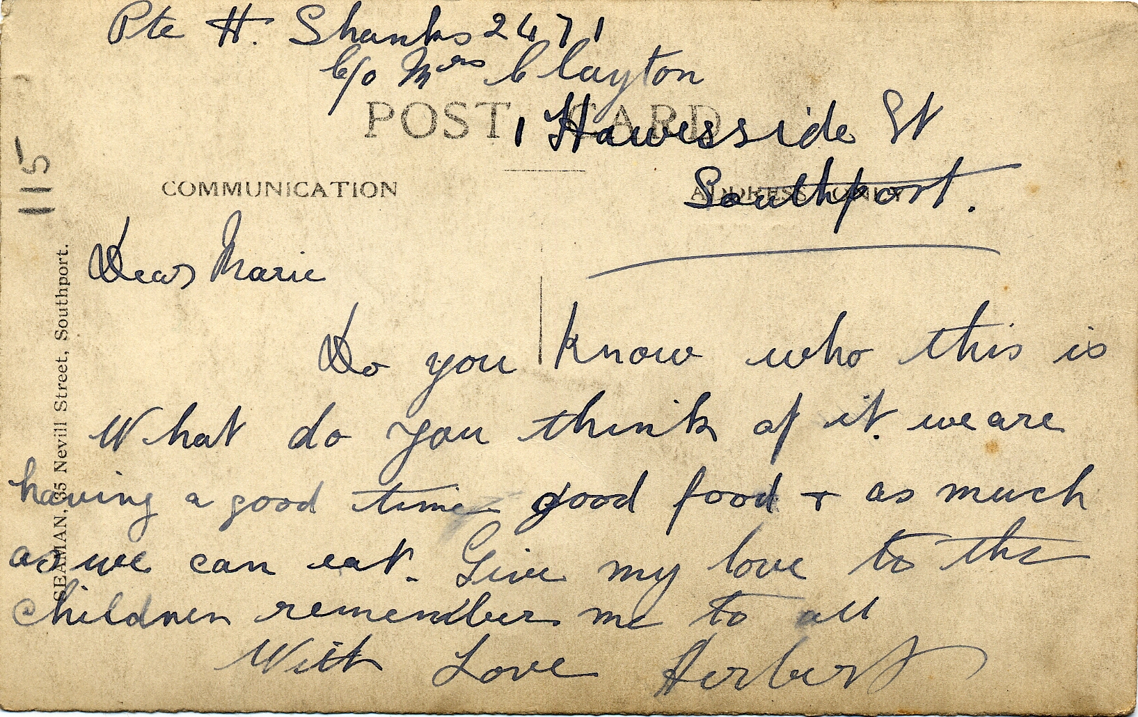Shanks, Herbert, enlisted at Manchester (resident of Manchester), 52114, Pte., killed in action, France & Flanders, 21/7/17, formerly 2471, Manchester Regiment.