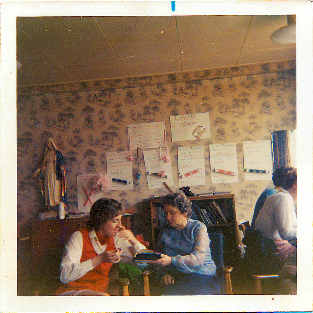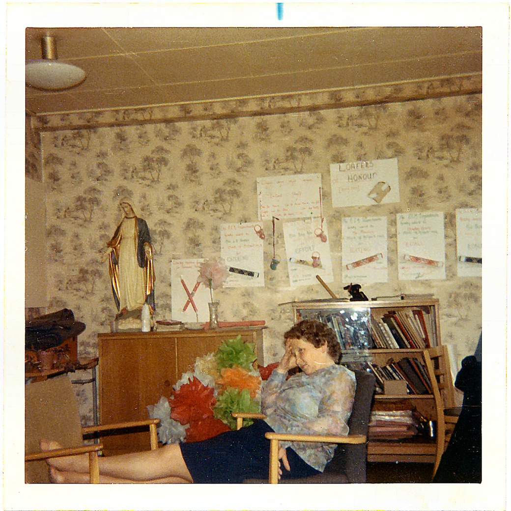 | "Mrs Reynolds - June 1971 St Scholastica's" staff room |