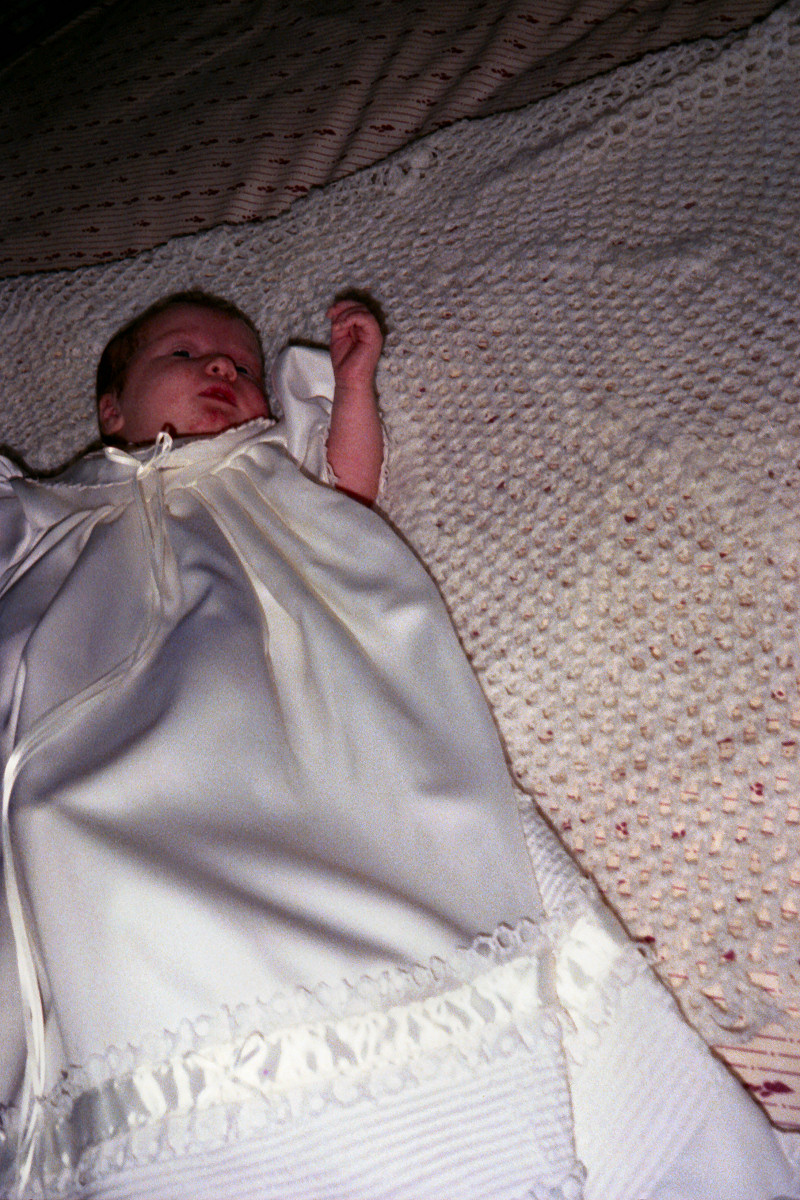 | 03. Wearing the dress worn by Steven Hayes, lying on the shawl knitted by Mary Bradley. |